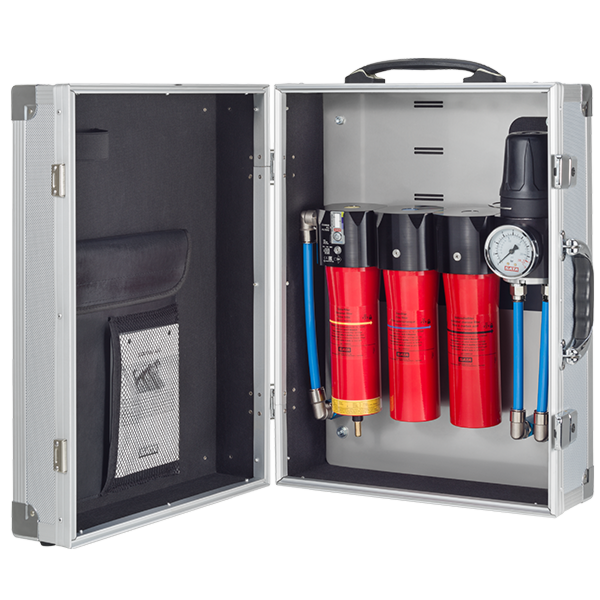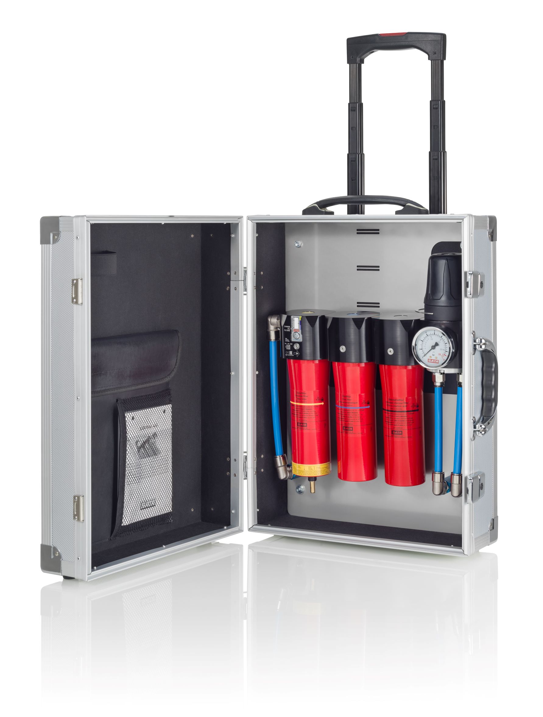 SATA filter 584 mobil 3-stufiger Sinter-/Fein-/Aktivkohle, Druckregler, Abgangsmodul (mit 2x Schnellkupplung) sowie 13 mm Druckluftschlauch im Trolley